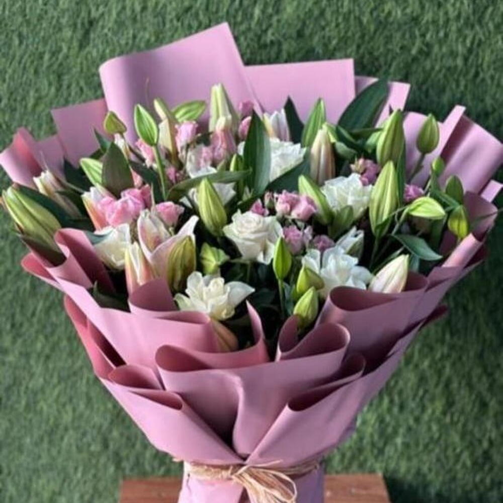 Las flores: El ramo presenta lirios rosados frescos y vibrantes, a menudo con pétalos grandes, en forma de estrella o de trompeta. El tono es un rosa suave y delicado, a veces exhibiendo un hermoso degradado de color. El follaje: Los lirios suelen estar complementados por abundantes acentos verdes y follaje, como el velo de novia (gypsophila) u otra vegetación, lo que crea un contraste sorprendente y realza la sofisticación del arreglo. Presentación: El arreglo suele estar atado a mano y presentado con un envoltorio elegante (que puede variar, como papel lujoso marrón/dorado o un envoltorio simple y chic) y rematado con una cinta a juego