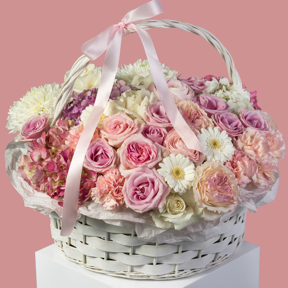 Hydrangea - 5 ud. crisantemo individual - 3 ud. carnation - 7 ud. ranunculus - 2 ud. gerbera mini - 4 ud. rosa david austin - 3 ud. cesta de mimbre - 1 ud. oasis (espuma) - 1 ud. rosa lena 50 llave - 15 ud. ohara rosa rosado (ecuador) - 3 ud.