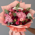 Red rose - 15 ud. La cinta - 1 ud. Eucalyptus - 4 ud. Pink rose - 15 ud. Wrapping - 6 ud. alstroemeria roja - 3 ud. pink spray rose - 2 ud. rosa blanca en aerosol - 2 ud. white hydrangea - 2 ud. hortensia rosa - 2 ud.
