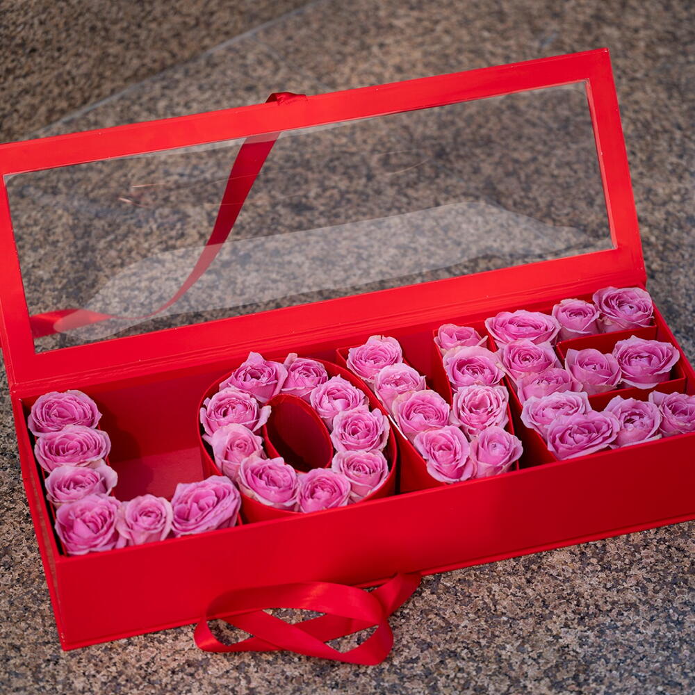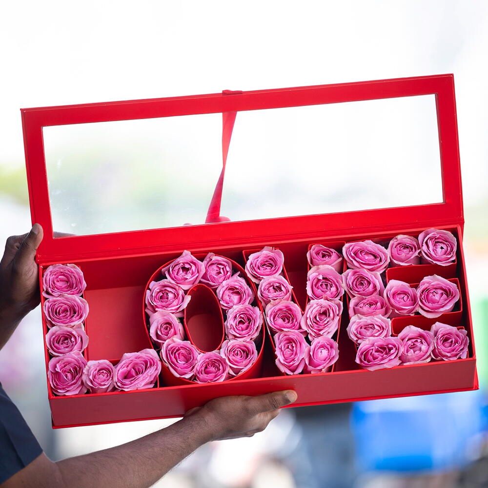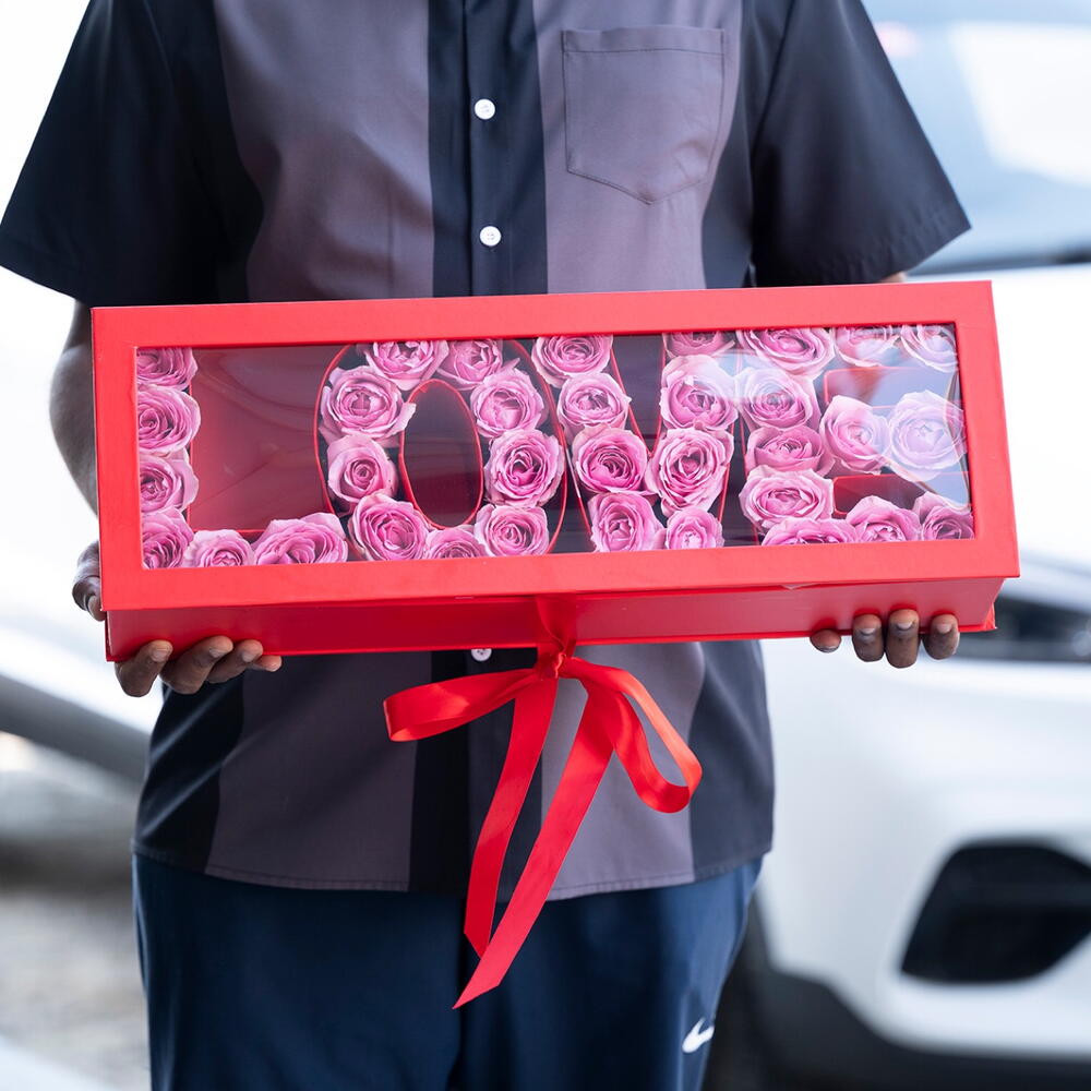 35 a 40 rosas rosadas dispuestas en una caja tipo ‘Love’.