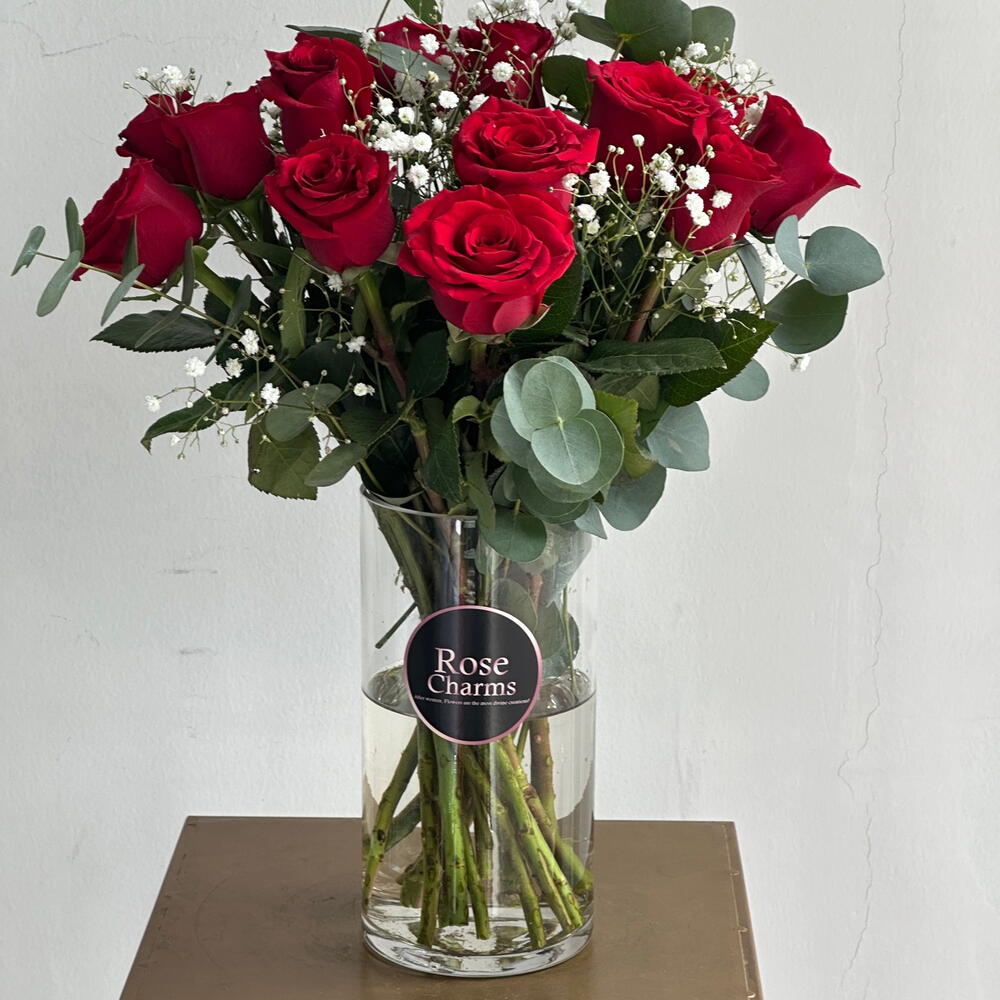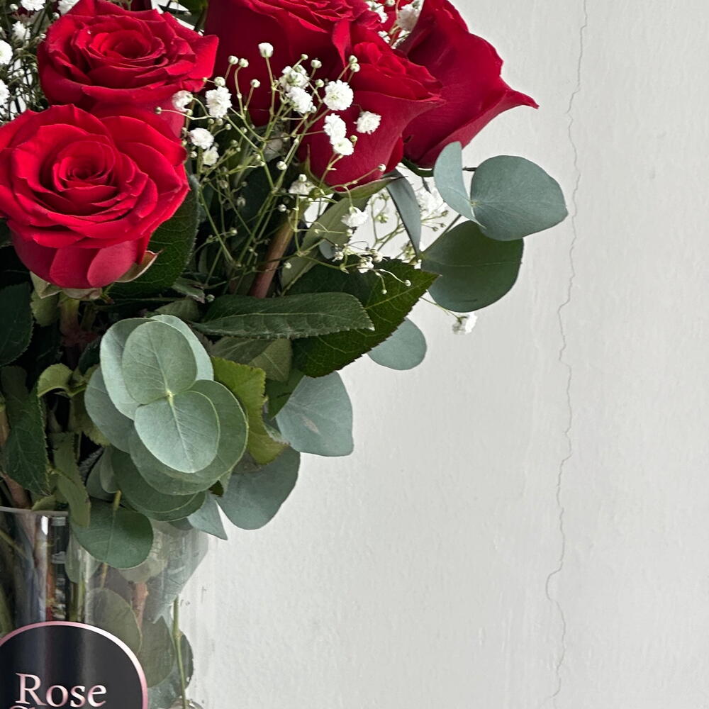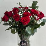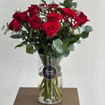 Eucalyptus - 7 ud. Gypsophila - 5 ud. jarrón de cristal - 1 ud. red roses - 15 ud.