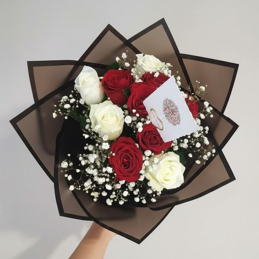 Este hermoso ramo es una mezcla perfecta de elegancia y romance, presenta una impresionante combinación de rosas rojas y blancas con delicado velo de novia llenando los espacios. Las suaves rosas blancas y las vibrantes rosas rojas crean un contraste atemporal, convirtiendo este ramo en un regalo ideal para ocasiones románticas o celebraciones. Con su diseño sofisticado y su delicado aroma, aporta tanto belleza como encanto a cualquier estancia. El ramo está cuidadosamente envuelto con un envoltorio negro que resalta la frescura y la viveza de las flores, creando un aspecto llamativo. Para su cuidado, mantenga las rosas en agua fresca y cambie el agua diariamente. Recorte los tallos aproximadamente 1 cm cada pocos días para mantener la frescura. Evite colocar el ramo a la luz solar directa para que dure más tiempo.