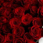 Un ramo de rosas rojas. Arreglo: El ramo presenta un número considerable de rosas vibrantes de un rojo intenso, posiblemente alrededor de 25 rosas de tallo largo, dispuestas de forma apretada.