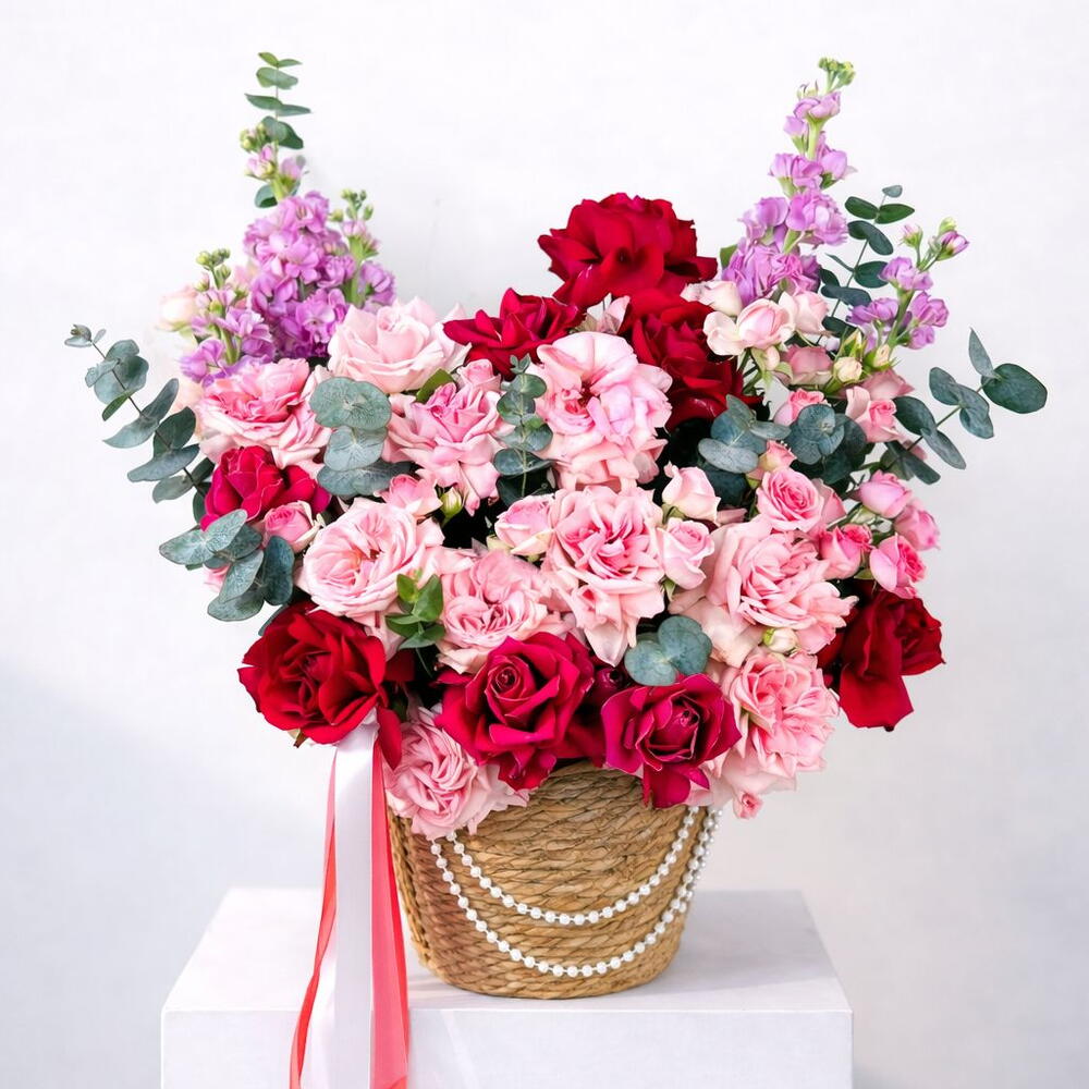 Eucalyptus - 5 ud. rosa ohara rosa - 10 ud. matthiola pink - 3 ud. rosa fucsia - 10 ud. rosa spray dinara rosa - 10 ud. hoja de pistacho - 3 ud.
