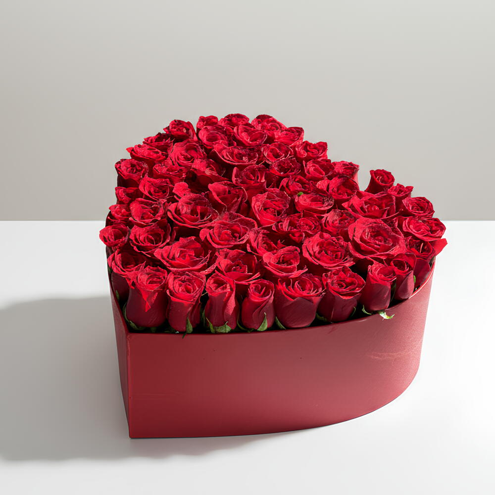 Arreglo de 51 rosas rojas en una caja en forma de corazón