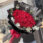 eucalyptus leaves - 3 ud. tallos de rosas rojas - 30 ud. cubrir - 5 ud.