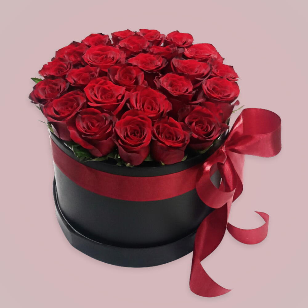 caja negra - 1 ud. rosas rojas con tallo - 30 ud. tallo de limonium - 2 ud. cinta roja1 - 1 ud.