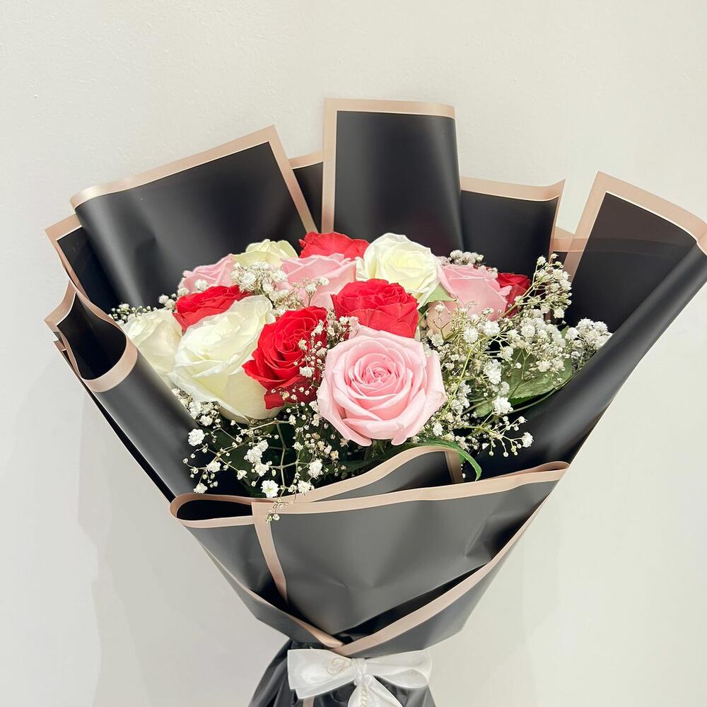 5 rosas blancas, 5 rosas fucsia, 5 rosas rosa claro, 3 gipsofila