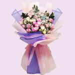 Precioso ramo rosa es un ramo que combina rosas de color rosa pálido y cremosas con paniculata etérea y eucalipto verde fresco. Las flores están delicadamente envueltas en materiales de tonos rosa pastel y lavanda, creando una presentación suave y elegante. Ideal para ocasiones románticas o como regalo que transmite elegancia y belleza sutil.