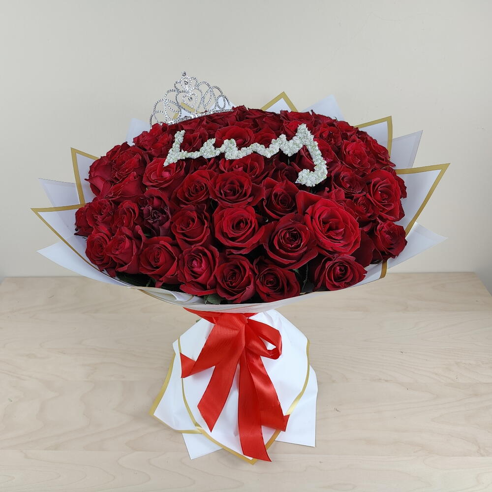 55pc of fresh red roses With 1pc Crown on the top of bouquet hand crafted black gold n line wrapping.