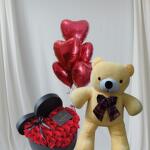 rosas rojas en caja con forma de corazón - 40 ud. globos de helio con forma de corazones rojos - 5 ud. oso de peluche80cm - 1 ud.