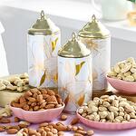 Anidados en una impresionante bandeja redonda de metal dorado se encuentran tres recipientes reutilizables blancos y dorados, cada uno relleno de almendras naturales, anacardos y pistachos, rodeados de rosas de un púrpura intenso, majestuosas alstroemerias púrpura y lisianthus. Eleva el arte de regalar con esta cesta que irradia sofisticación.