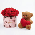 Caja de rosas rojas de lujo con osito de peluche