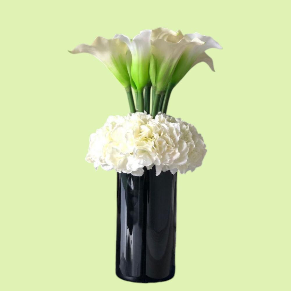 jarrón de cristal - 1 ud. white hydrangea - 4 ud. lirios de cala - 10 ud.