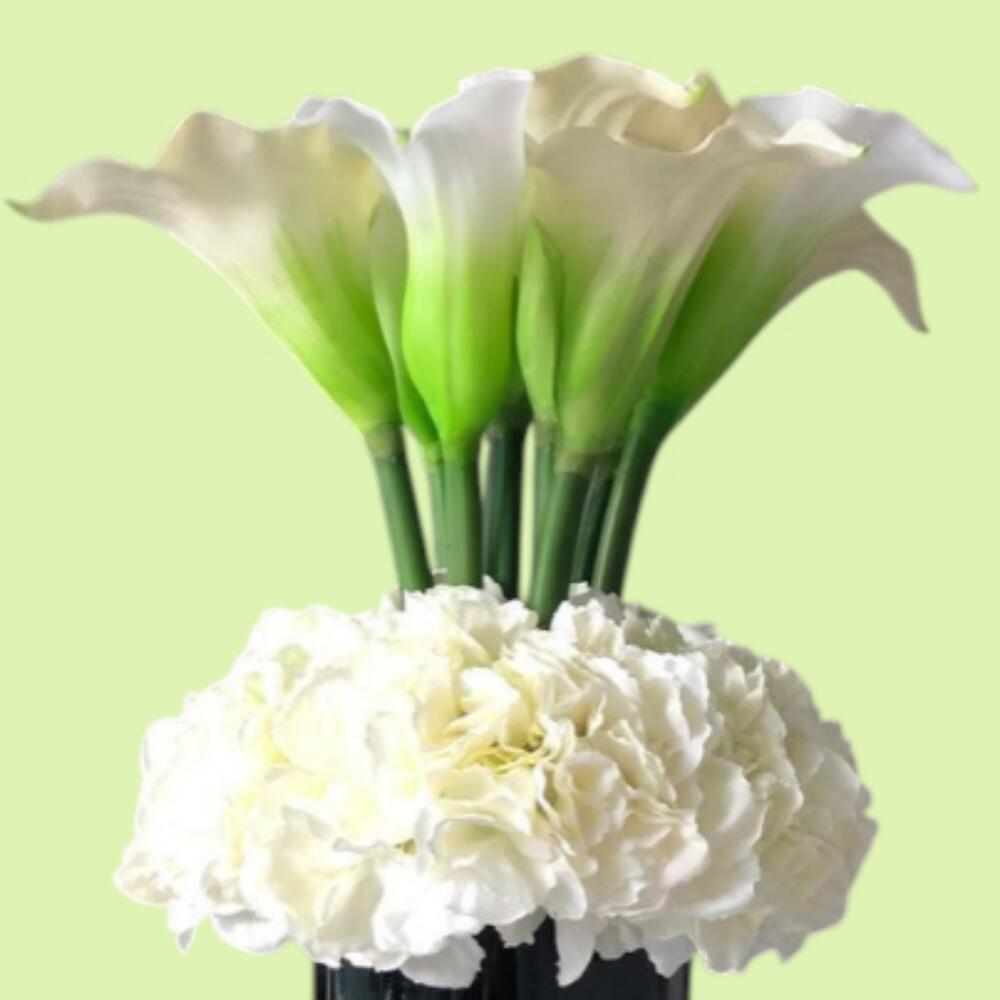 *¡Pura elegancia en un jarrón! 🤍 Este lujoso arreglo presenta gráciles calas blancas que se alzan sobre una cama de esponjosas hortensias blancas — una mezcla perfecta de sofisticación y serenidad. Ideal para la decoración del hogar, eventos formales o para regalar a alguien con un gusto atemporal.*
