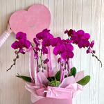 Cinco impresionantes plantas de orquídea rosa/púrpura en una caja extragrande en forma de corazón rosa, completas con la vela de terciopelo de Plaisir y una caja de deliciosos chocolates, harán de esto un regalo para recordar sin importar la ocasión!