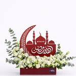 Celebrate the holy month with elegance and grace through our Luxury Ramadan Floral Arrangement, exclusively designed by Arabian Blossom. This premium arrangement features: 🌙 Elegant crescent moon mosque Ramadan design 🌹 Fresh white roses symbolizing peace and purity 🌿 Baby’s breath eucalyptus for a refined finish 🎁 Modern red base for a sophisticated festive touch