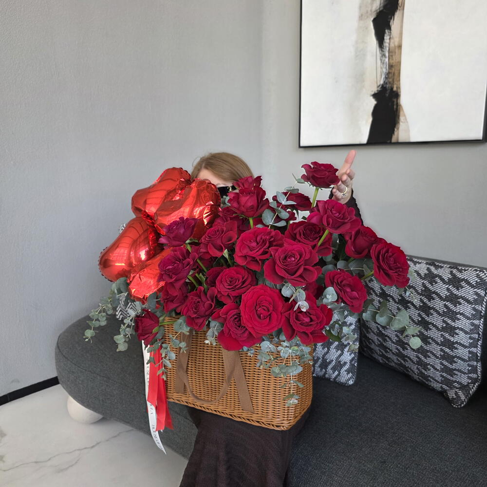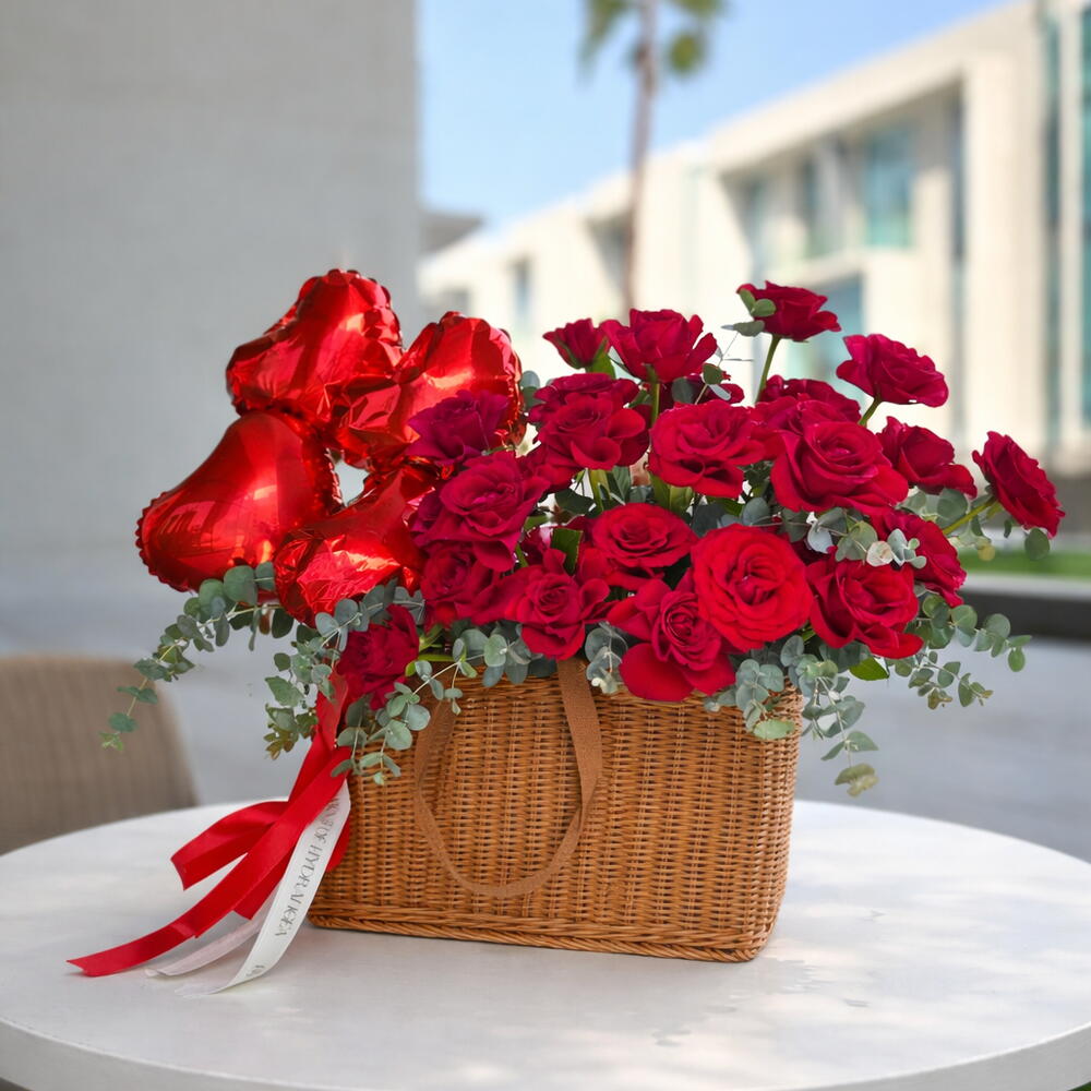Basket - 1 ud. red roses - 30 ud. globos en forma de corazón - 4 ud. manojo de follaje - 1 ud.