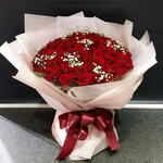 Fresh 35pcs of red roses with some of gypsophila white looks amazing combination, hand crafted light pink wrapping.
