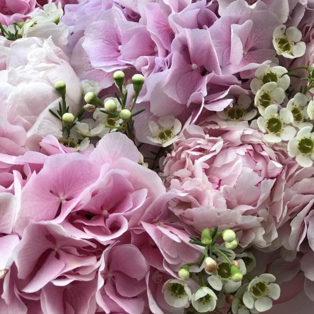 La cinta - 2 ud. Hydrangea - 7 ud. Box - 1 ud. Peony pink - 7 ud. chamelacium - 5 ud.