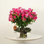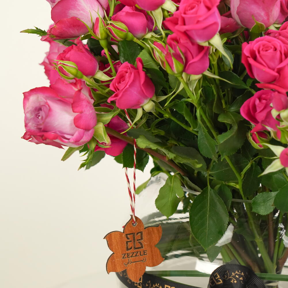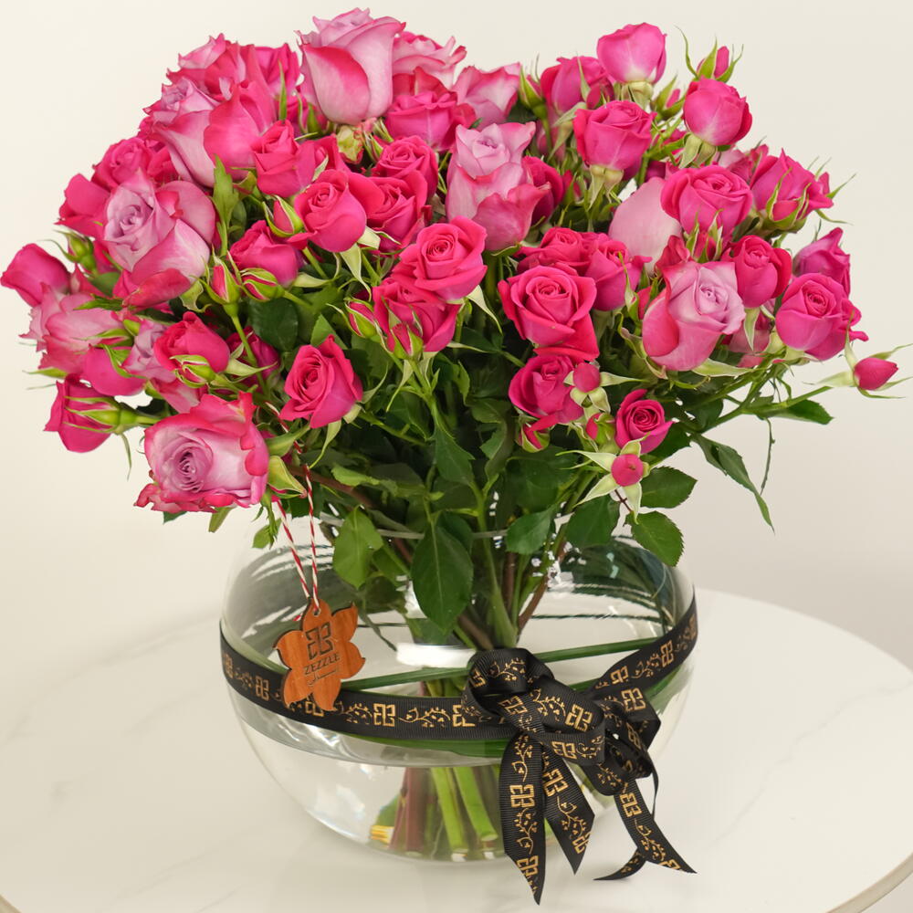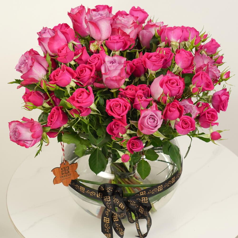 Un lujoso arreglo de 10 rosas moradas y 20 rosas spray fucsia, bellamente exhibido en un cuenco de cristal. Majestic Petals combina elegancia y encanto, convirtiéndolo en el regalo perfecto para expresar amor, admiración o celebración.
