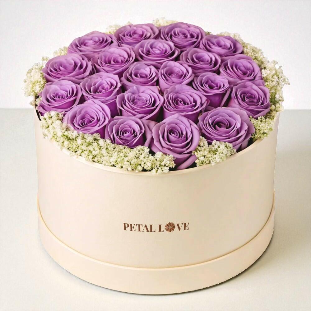 Una verdadera obra maestra de elegancia, este arreglo en caja redonda tipo sombrerera presenta una lujosa colección de rosas lavanda, que simbolizan encanto, gracia y admiración. Rodeado por un delicado borde de paniculata (gypsophila), el diseño desprende sofisticación y encanto, convirtiéndolo en un regalo inolvidable para cumpleaños, aniversarios o simplemente para alegrar el día de alguien. La suave caja color marfil crea un contraste perfecto con las flores vibrantes, destacando su belleza natural. Para mantener el arreglo fresco, colóquelo en un lugar fresco, alejado de la luz solar directa y del calor. Rocíe ligeramente las flores diariamente, asegurándose de que la espuma floral permanezca húmeda para una frescura duradera. Esta caja floral no es solo un regalo: es un gesto atemporal de amor y admiración.