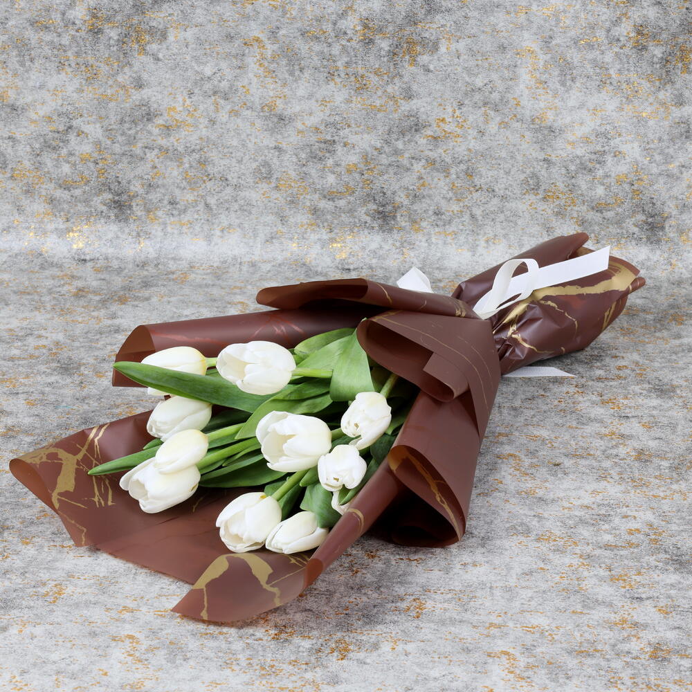 11 tulipanes blancos Preciosamente envueltos en papel color mármol marrón Atados con cinta blanca