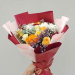 Un ramo vibrante y elegante, diseñado con un marcado contraste y una rica armonía de colores. Rosas en cálidos tonos amarillo y naranja dorado se combinan a la perfección con delicadas flores blancas y delicados toques morados. El exuberante follaje y las delicadas flores de relleno aportan frescura y textura al arreglo. Envuelto en un llamativo papel rojo intenso y un suave tono rosado, este ramo se siente moderno y expresivo. La dinámica paleta de colores simboliza alegría, pasión y emociones profundas. Perfecto para celebraciones, felicitaciones o regalos significativos. Este ramo está diseñado para destacar y dejar una huella imborrable.