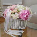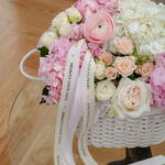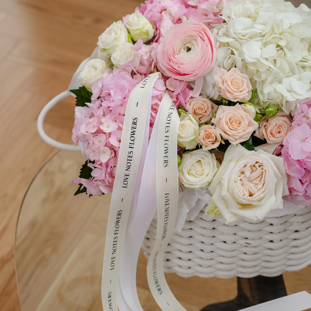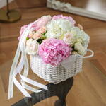 La cinta - 4 ud. rosa blanca en aerosol - 12 ud. white ohara - 2 ud. white hydrangea - 2 ud. hortensia rosa - 3 ud. rosas en spray color melocotón - 8 ud.