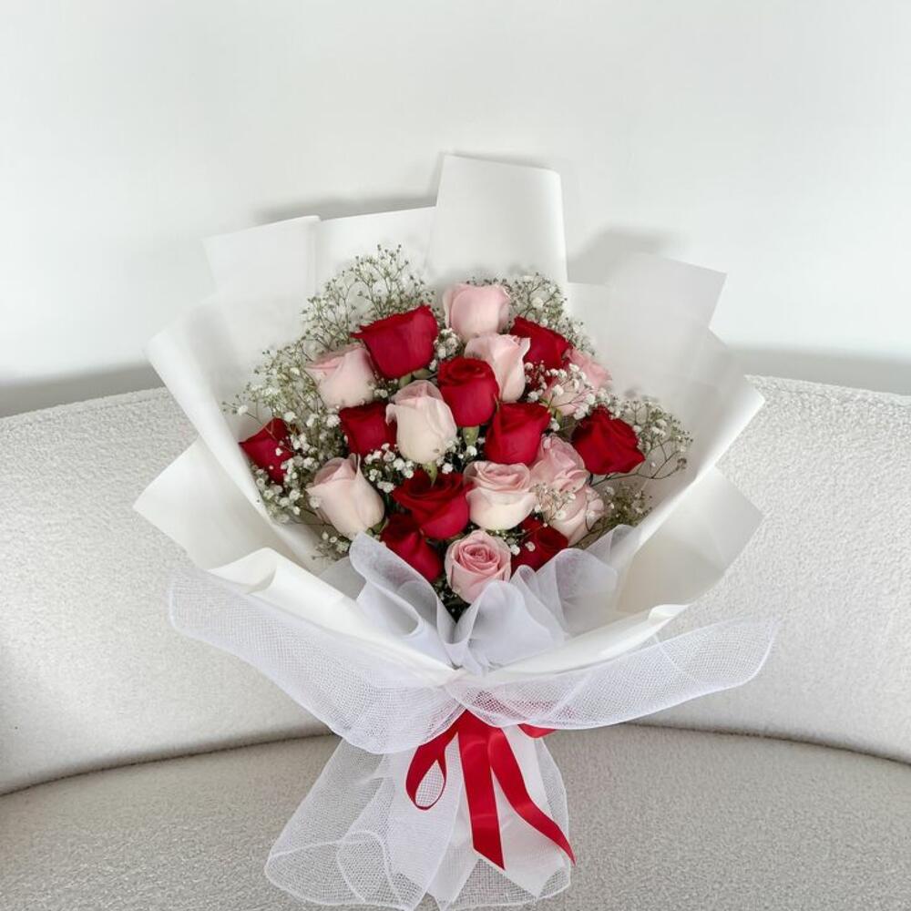20 piezas de rosas mixtas frescas, 10 rojas, 10 rosadas, con Gypsophila, ramo mixto de flores hecho a mano con envoltura blanca,