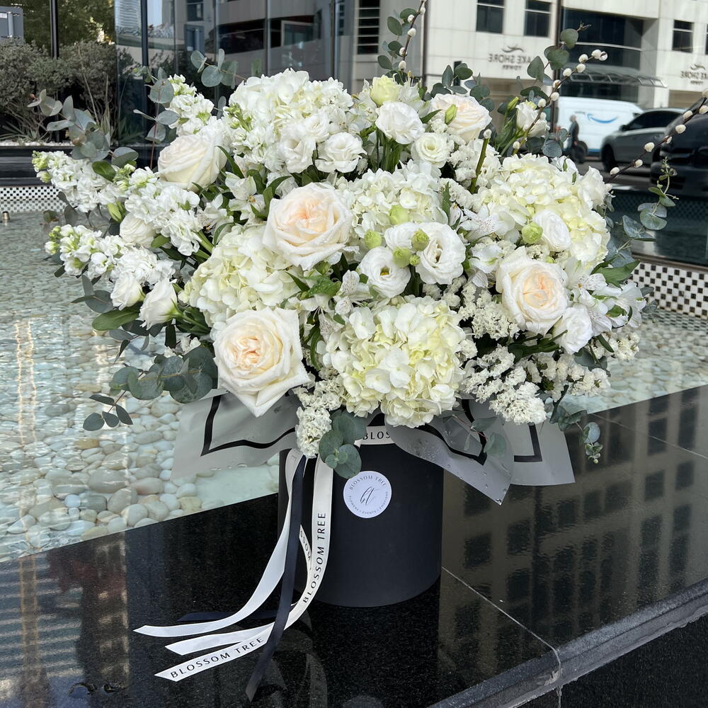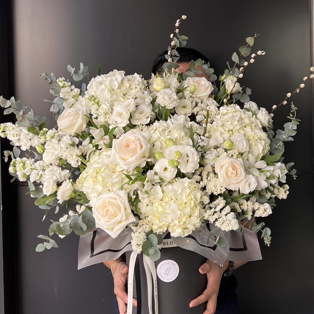 Delight in this breathtaking display of Flowers in a Box, a stunning assembly of 10 alluring Statice, 5 aromatic Eucalyptus, 5 soft Hydrangea, 10 enchanting Lisianthus, and 5 exquisite roses of the Ohara variety. Each bloom has been chosen with great care, offering a beautiful colour palette and a symphony of fragrance. An epitome of natural beauty and elegance, this graceful collection makes a perfect gift for every occasion or a sophisticated decor piece for your own home.
