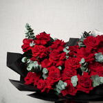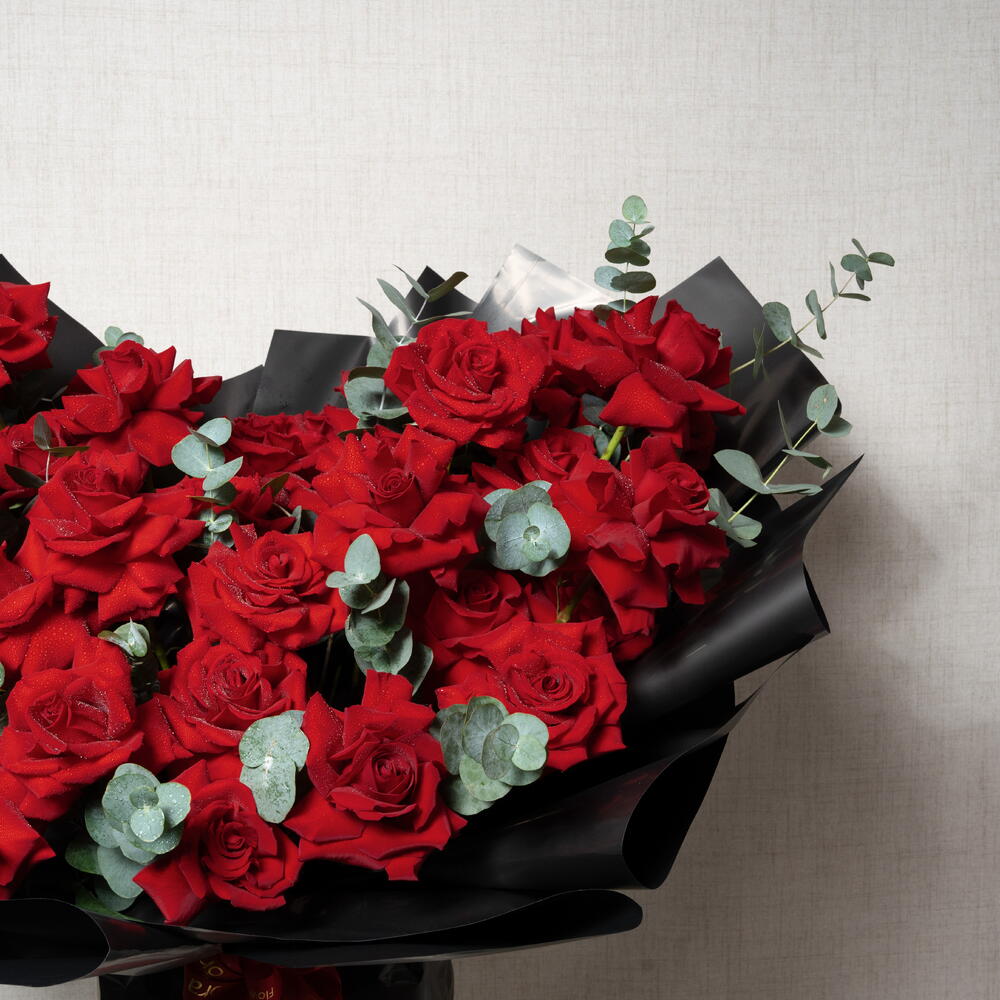 Un gesto de amor impresionante, este ramo presenta 47 rosas rojas completamente abiertas, simbolizando la pasión, la devoción y el sentimiento sincero. El delicado follaje de eucalipto aporta una fragancia suave y romántica, realzando la belleza de cada rosa. Presentado en un lujoso envoltorio negro y atado con una cinta roja, este ramo es la expresión perfecta de un afecto profundo y de un amor duradero.