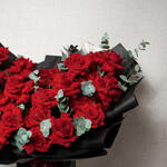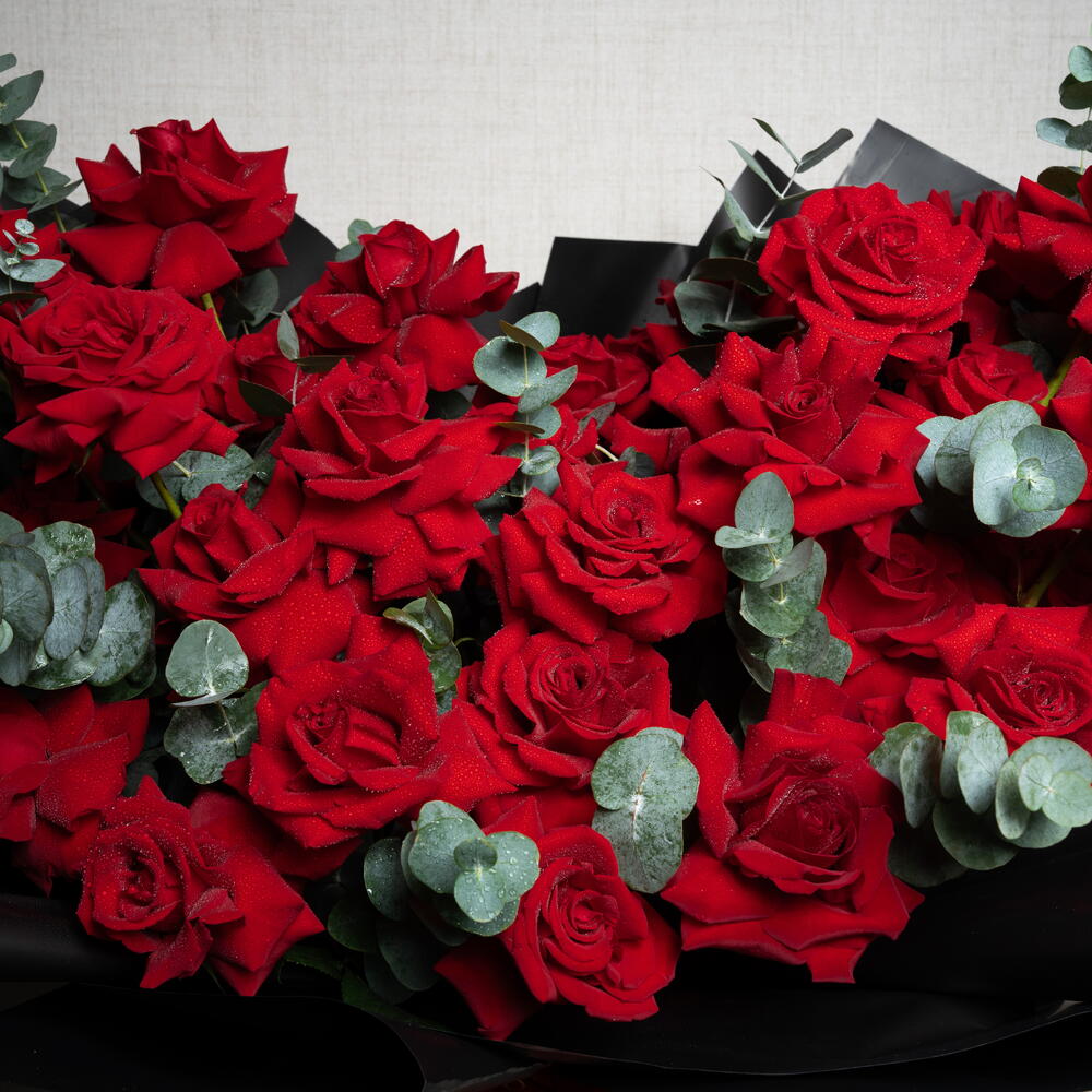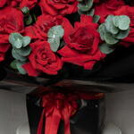 Eucalyptus - 10 ud. Red ribbon - 1 ud. rosas rojas premium abiertas - 47 ud. papel de regalo negro premium - 15 ud.