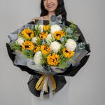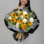 Eucalyptus - 2 ud. Solidago - 15 ud. Sunflower - 9 ud. deco blanco - 8 ud.