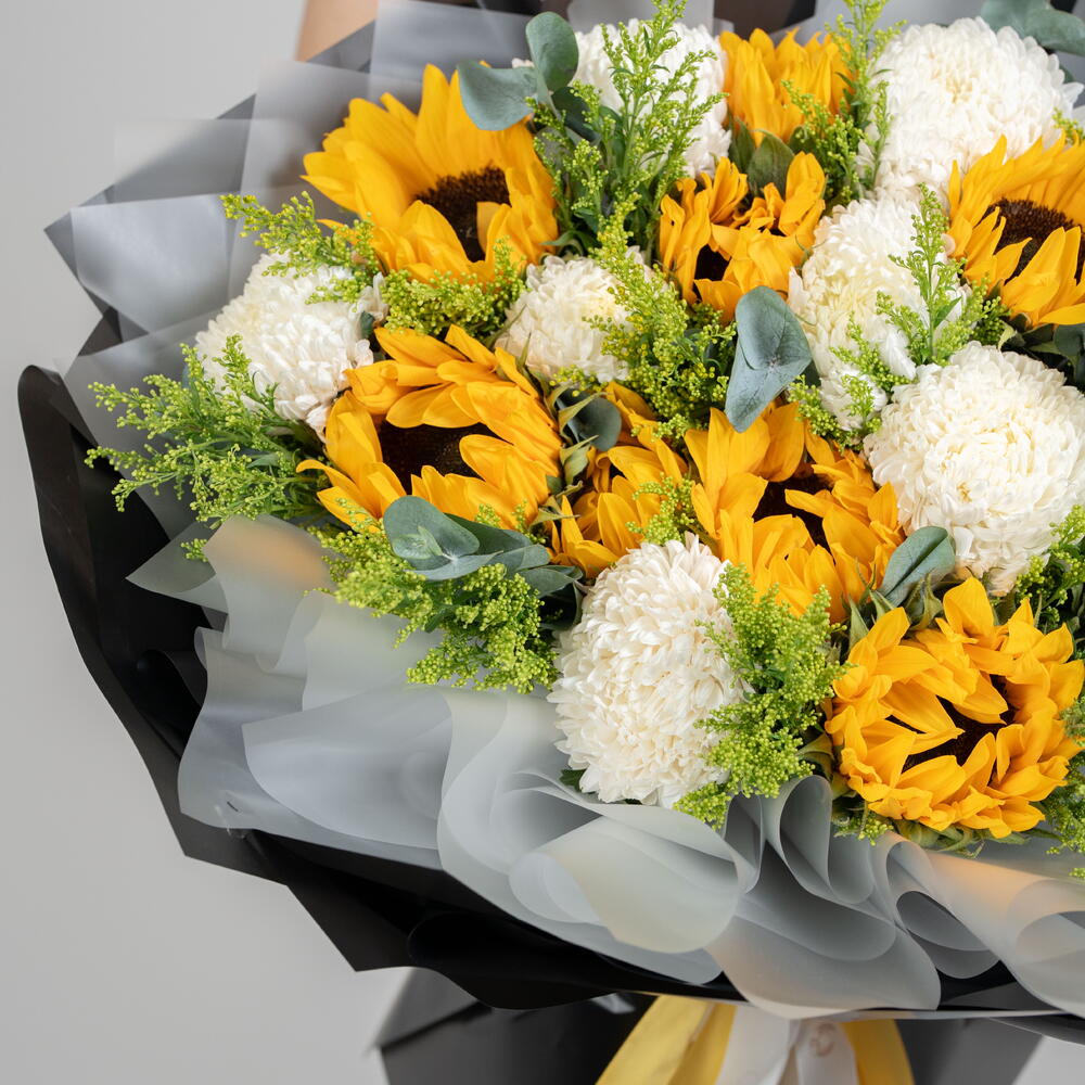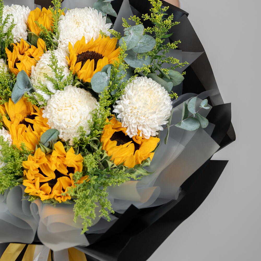 Eucalyptus - 2 ud. Solidago - 15 ud. Sunflower - 9 ud. deco blanco - 8 ud.