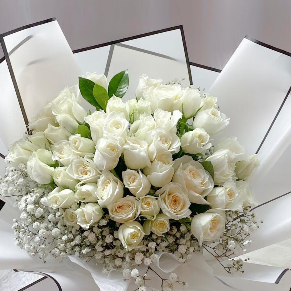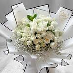 *Elegante y sereno, este ramo de rosas de un blanco cremoso con delicado velo de novia es una suave expresión de pureza, paz y amor sincero. Perfecto para esos momentos tiernos cuando las palabras no son suficientes.