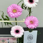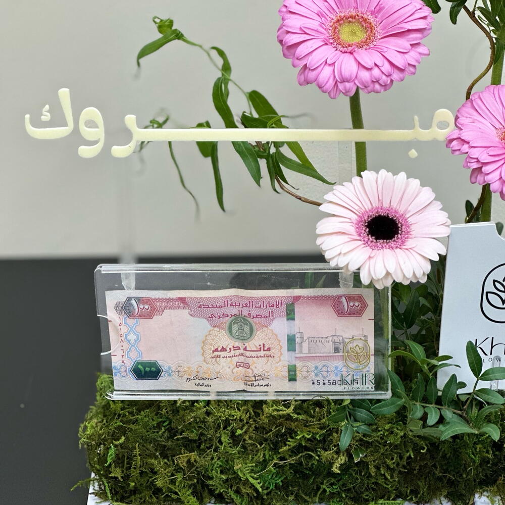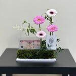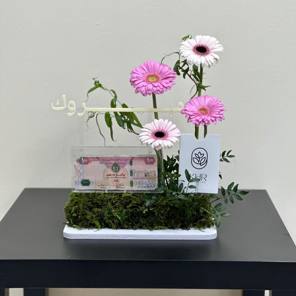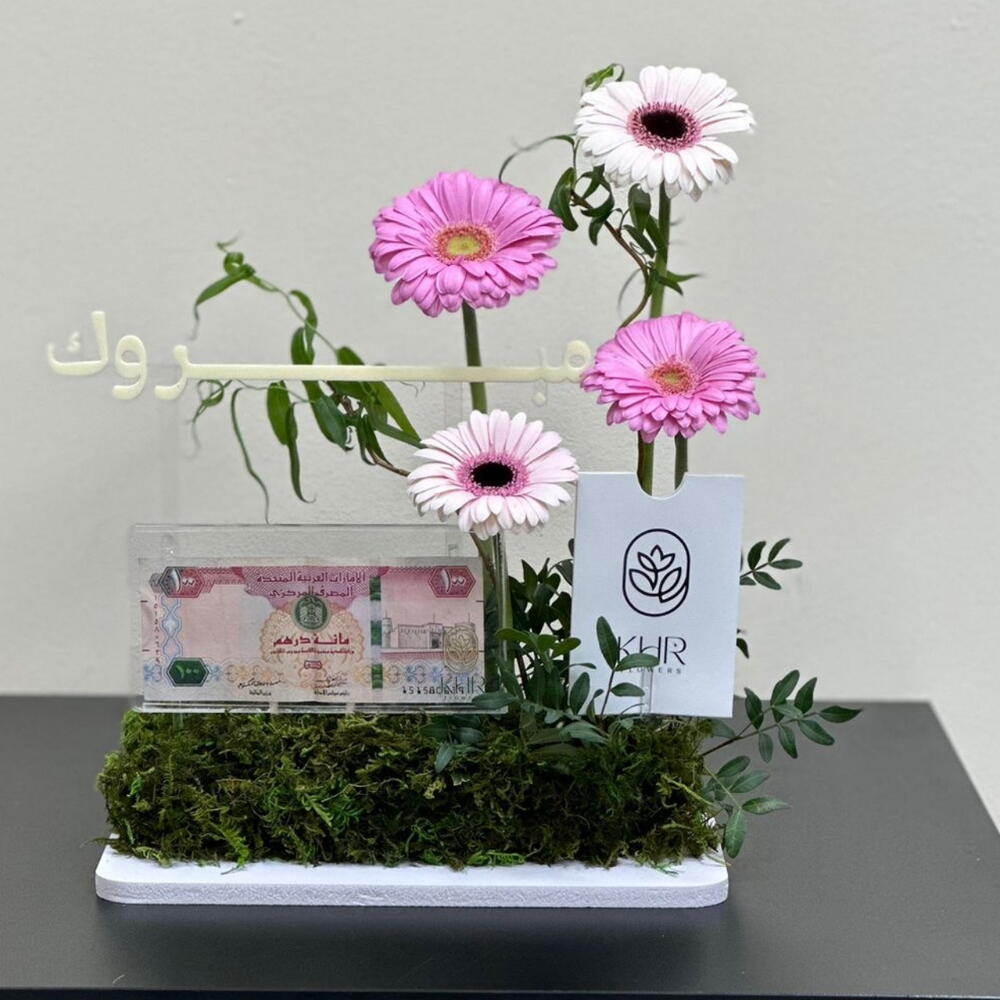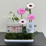 gerbera pink - 2 ud. gerbera blanca - 2 ud. pestashiya vete - 2 ud. caja acrílica para dinero 1 - 1 ud.
