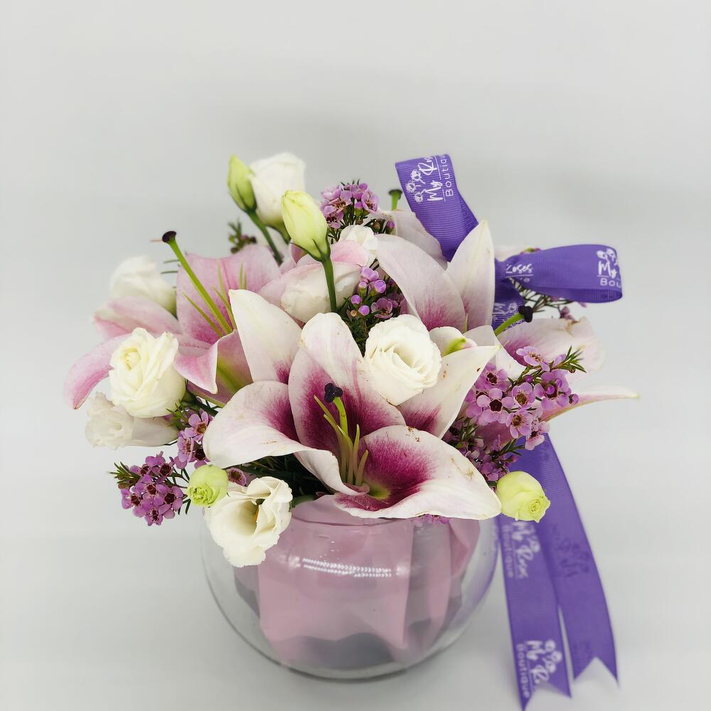 1 lirio rosa 2 flor de cera rosa Eustoma blanco 3