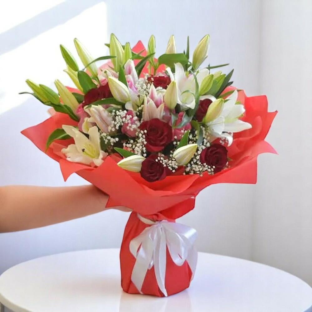 Red rose - 10 ud. Gypsophila - 6 ud. lily white - 8 ud. lirio rosa - 3 ud.