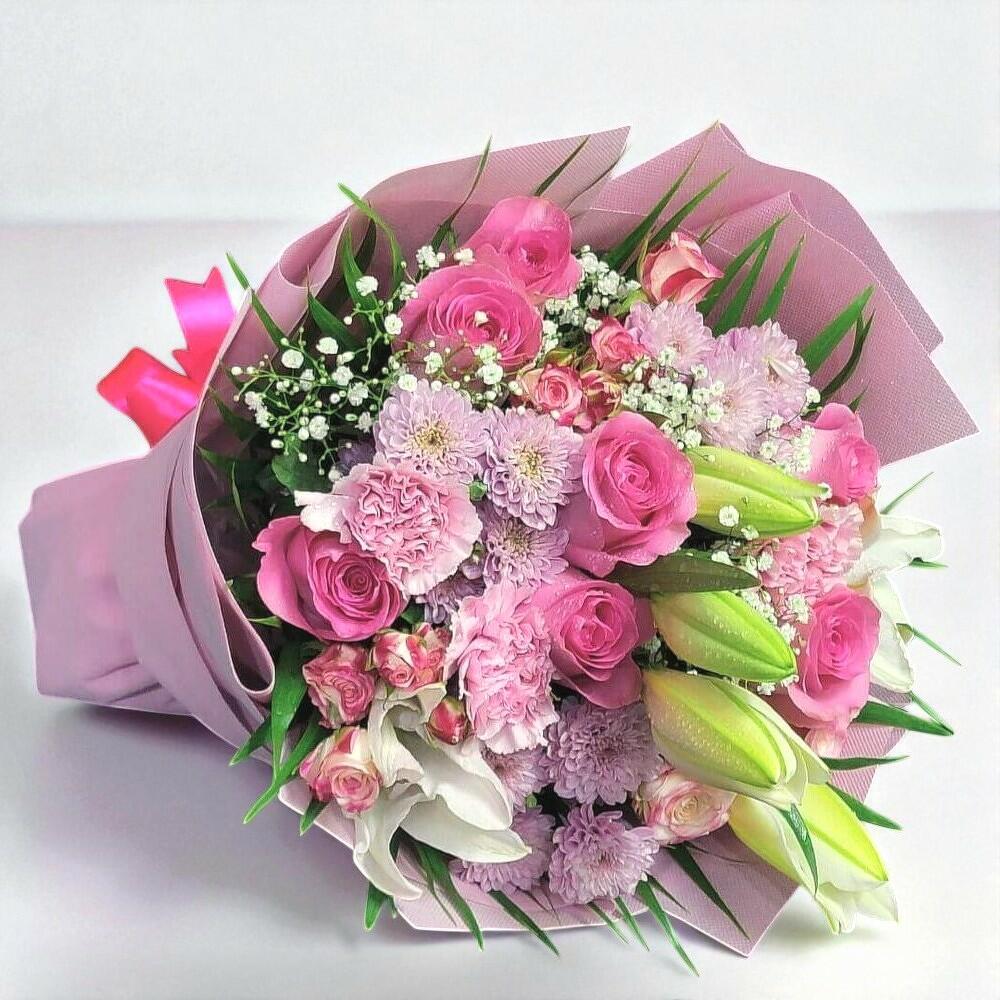 Un arreglo de ensueño en suaves tonos rosa, este ramo irradia elegancia y gracia. Con una encantadora combinación de rosas, lirios, crisantemos, rosas en spray y gipsófilas, está envuelto en papel en tonos rosados y atado con una cinta de raso. Para mantenerlo fresco, corte los tallos en diagonal cada dos días, colóquelo en agua limpia y manténgalo alejado de la luz solar directa o fuentes de calor. Renueve el agua a diario y retire las flores u hojas marchitas. Este ramo no solo añade encanto a cualquier espacio, sino que también transmite mucho cariño y calidez. Ideal para momentos especiales como cumpleaños, aniversarios o cualquier ocasión especial, este ramo de flores trasciende lo ordinario y se convierte en una manifestación tangible de amor. Envíelo como regalo de cumpleaños, exprese deseos de aniversario, transmita sentimientos de pronta recuperación o simplemente deséele un momento de amor a un ser querido.