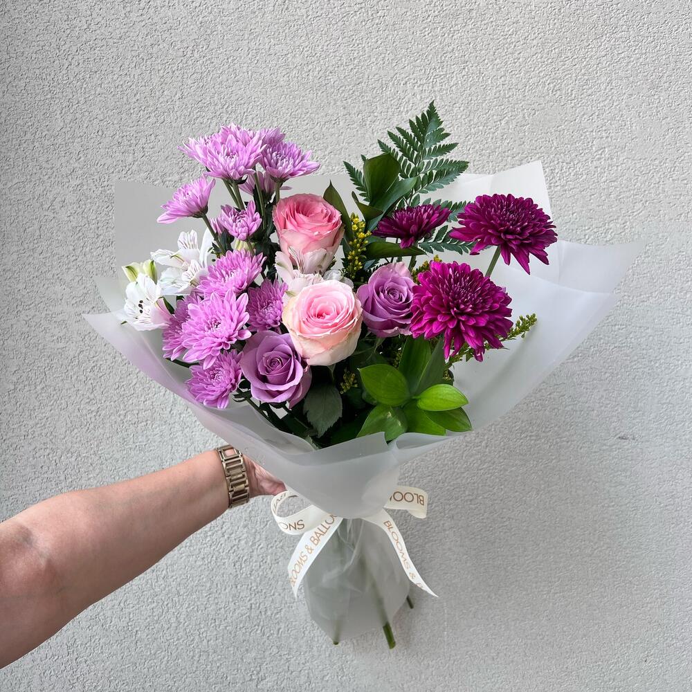Ruscus - 2 ud. crisantemo rosa - 2 ud. crisantemo púrpura - 1 ud. roses - 4 ud. astrometría - 1 ud.