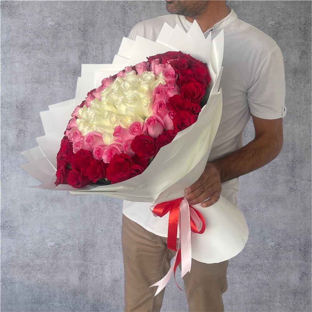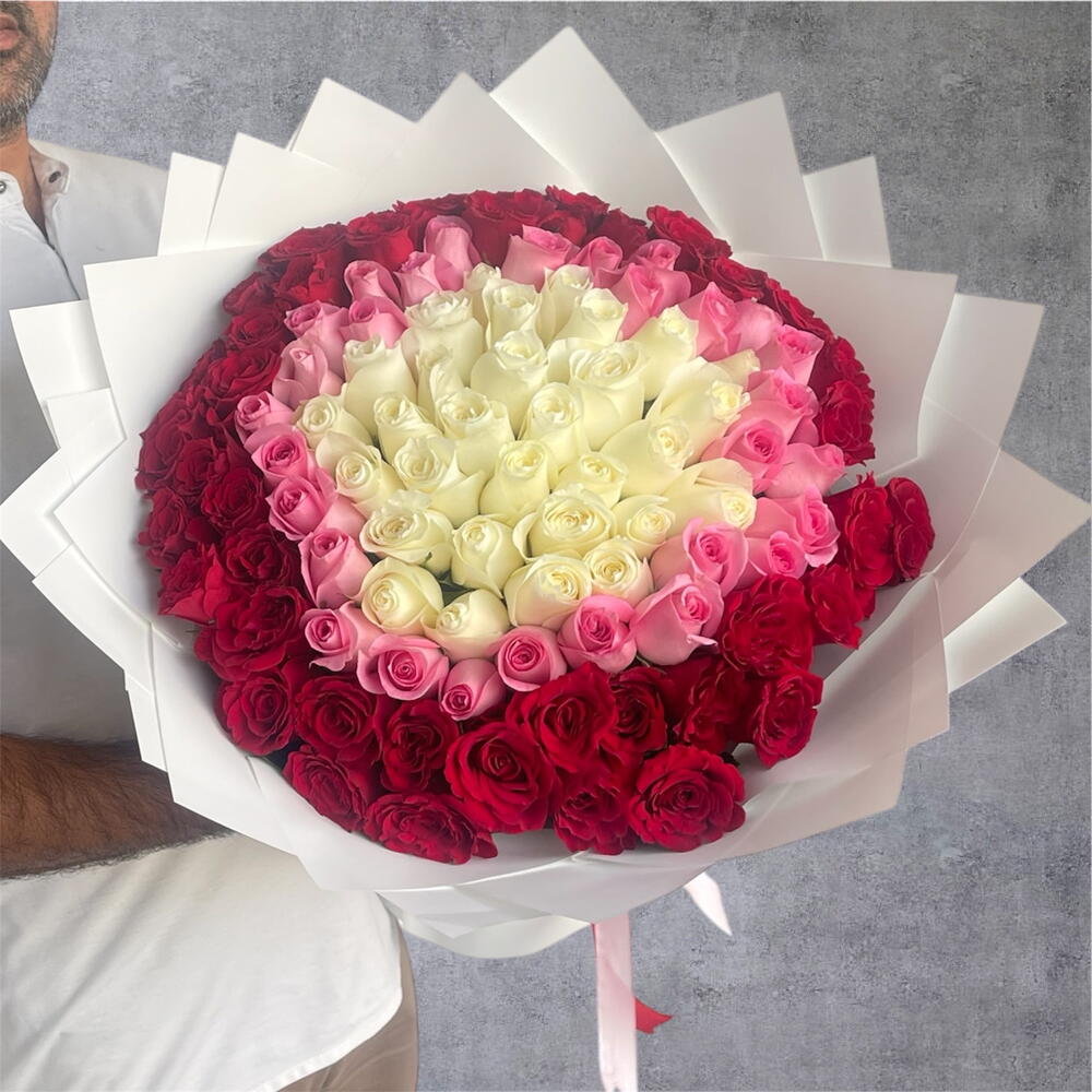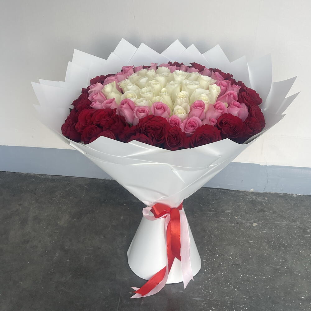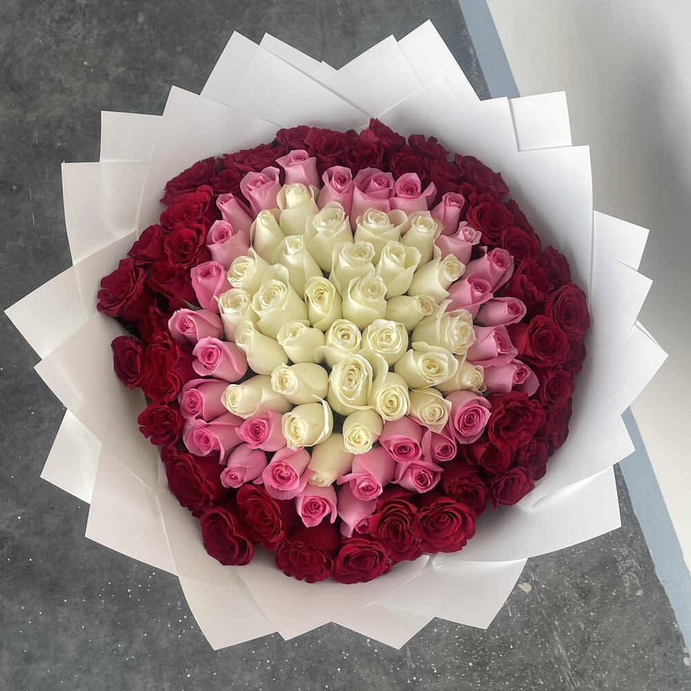 Descubre un mundo de belleza encantadora con nuestro Mono Bouquet, un exquisito arreglo que irradia pura elegancia y encanto. Compuesto por 40 rosas blancas prístinas, entrelazadas armoniosamente con 31 rosas rojas divinas y 30 rosas rosadas vibrantes estilo revival, este ramo encapsula una sensación de amor, pureza y pasión. Hábilmente envuelto en 8 hojas de lujoso papel blanco y acentuado con llamativas cintas rosas y rojas, este ramo añade un toque de sofisticación clásica, lo que lo convierte en el regalo perfecto para cualquier ocasión.