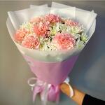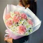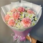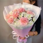 claveles rosas - 7 ud. crisantemo blanco - 5 ud. ribbon satin - 1 ud. envoltorio rosa - 2 ud.