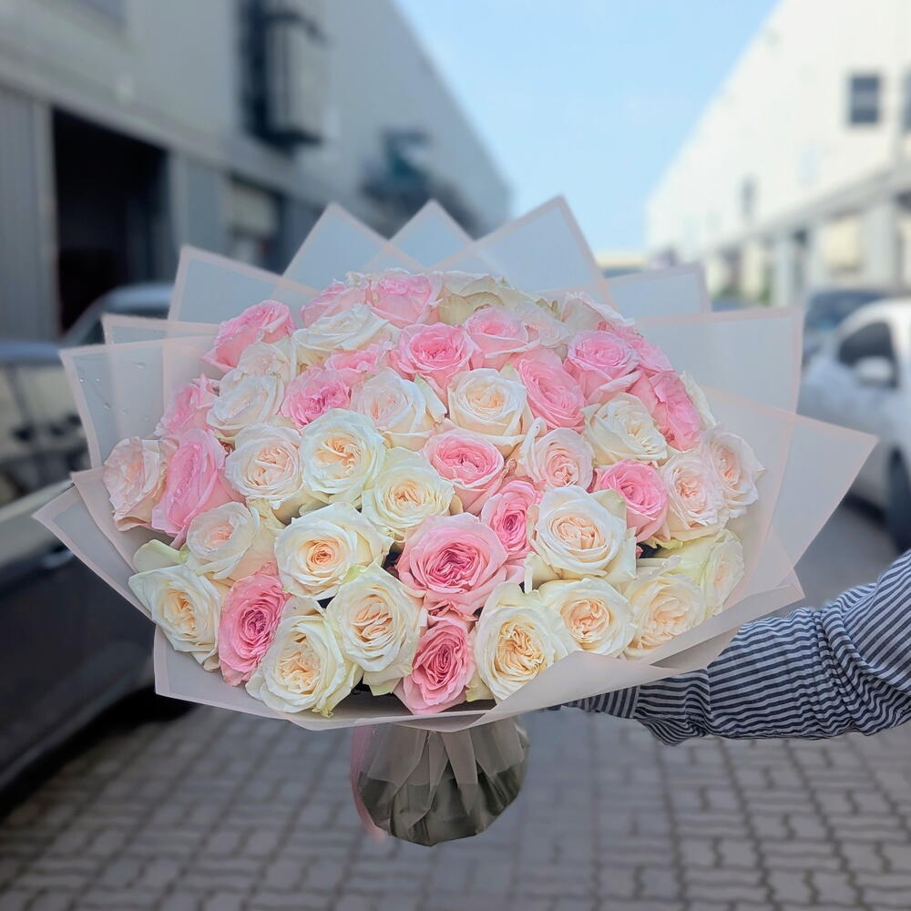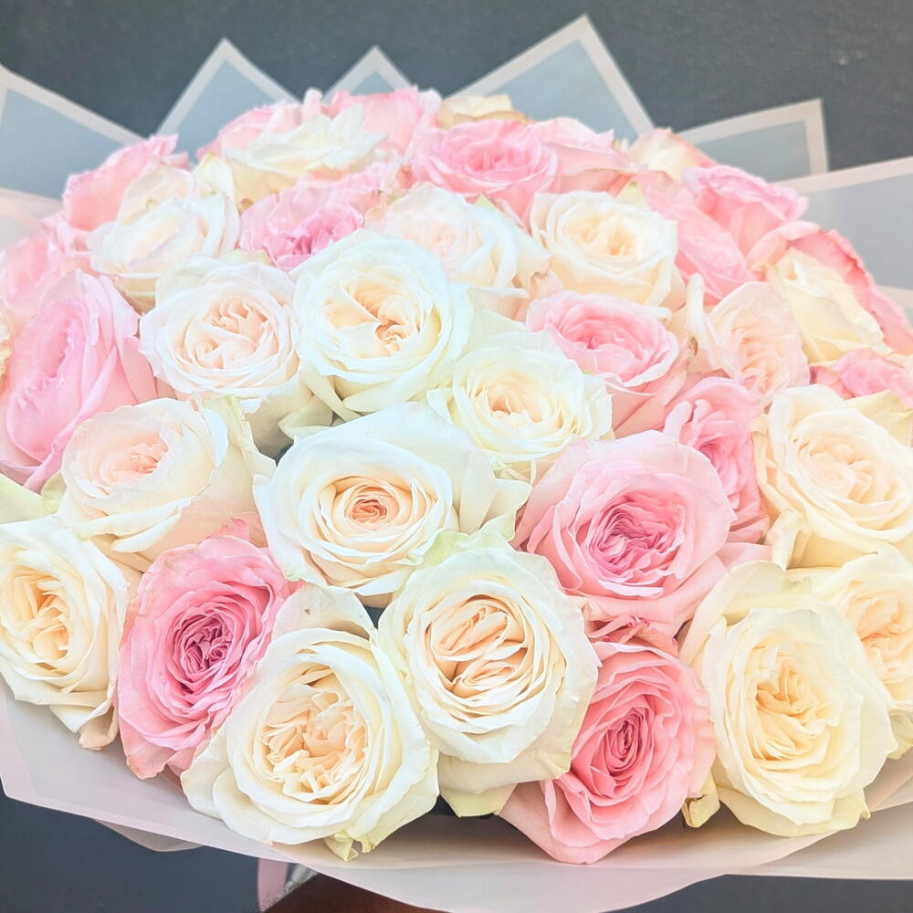 Un elegante ramo atado a mano elaborado con rosas O’Hara blancas y rosadas de primera calidad, conocidas por sus grandes pétalos rizados y su fragancia naturalmente rica y aromática. Las rosas están bellamente dispuestas en una cúpula llena y redondeada, combinando un suave rosa rubor con tonos blancos cremosos para un aspecto romántico y lujoso de estilo jardín. Envuelto en papel translúcido refinado con un acabado pulcro y moderno, este ramo resalta la belleza natural y el encanto de cada flor. Perfecto para expresar amor, admiración y gracia, es una elección ideal para bodas, aniversarios, momentos emotivos y un regalo de cumpleaños memorable que deleita tanto visual como sensorialmente.