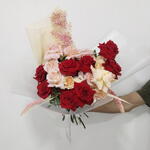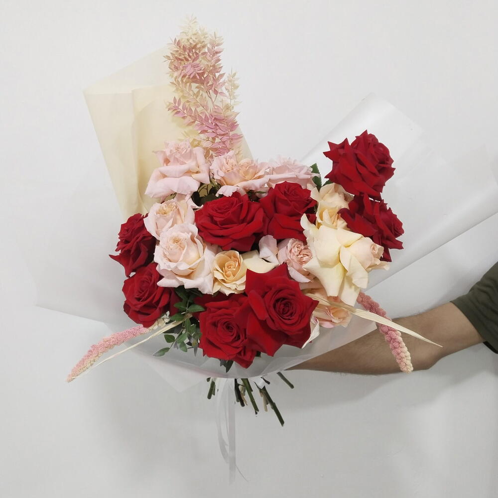 Ramo mixto de rosas – arreglo de rosas rojas y durazno para ocasiones especiales Este impresionante ramo presenta una mezcla vibrante de rosas rojas y durazno, artísticamente dispuestas con un delicado envoltorio blanco para un toque elegante. Perfecto para bodas, aniversarios o regalos románticos, este arreglo floral muestra flores frescas en tonos suaves, pastel y rojo intenso. Pide este hermoso ramo de rosas para hacer cualquier ocasión inolvidable. Entrega rápida disponible en Dubái y zonas circundantes.