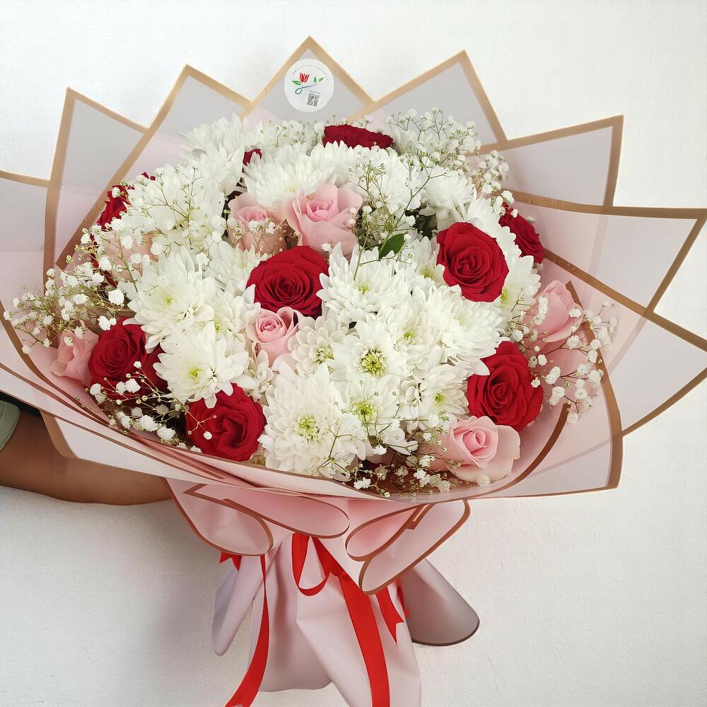 Red rose - 10 ud. Gypsophila - 8 ud. rosa melocotón - 10 ud. crisantemum - 10 ud.