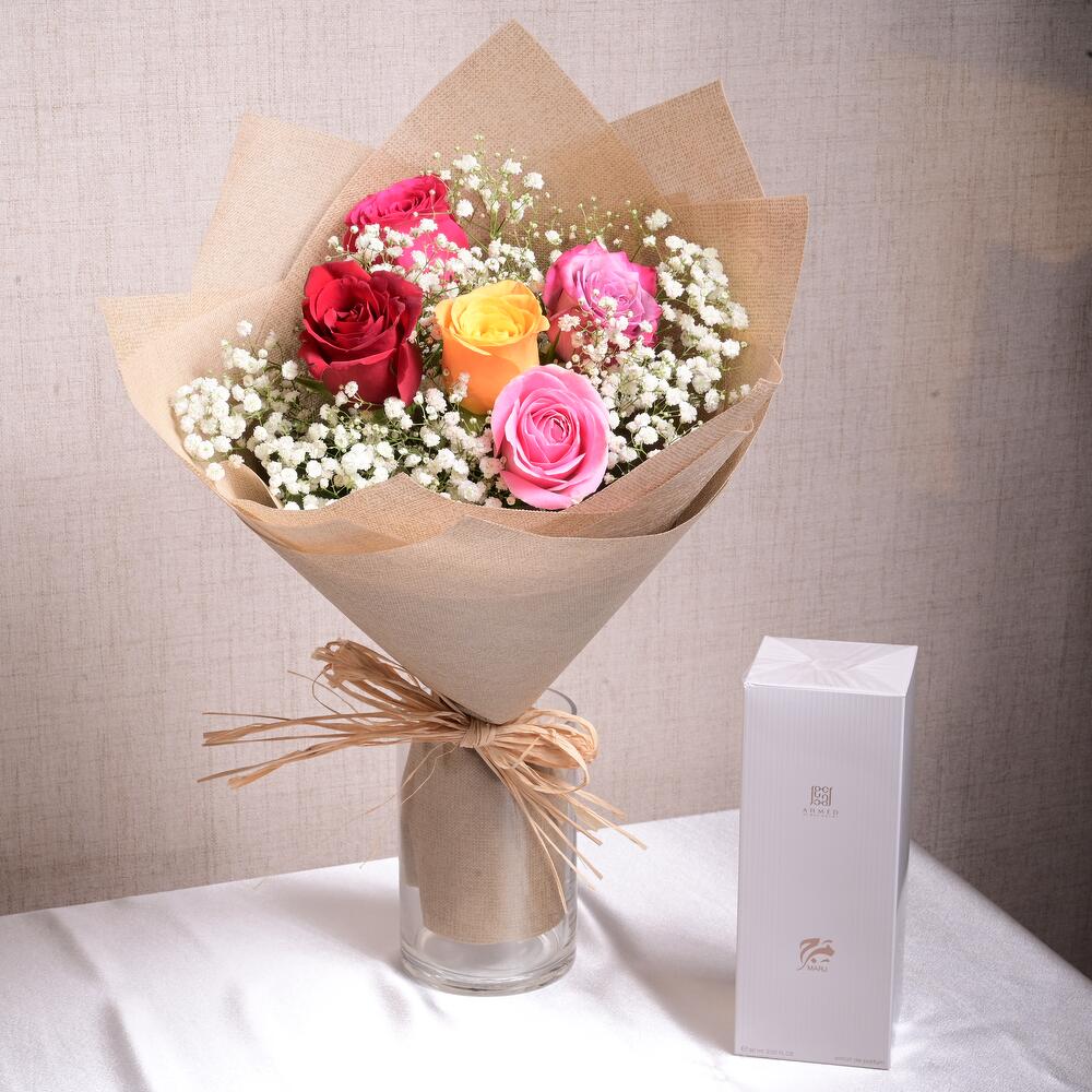 Incluye un ramo de rosas de 5 colores acompañado del perfume Marj de Ahmad Al Maghribi. Ideal para cumpleaños, regalos de agradecimiento o cualquier momento especial. Flores frescas y fragancia de lujo en un solo set.
