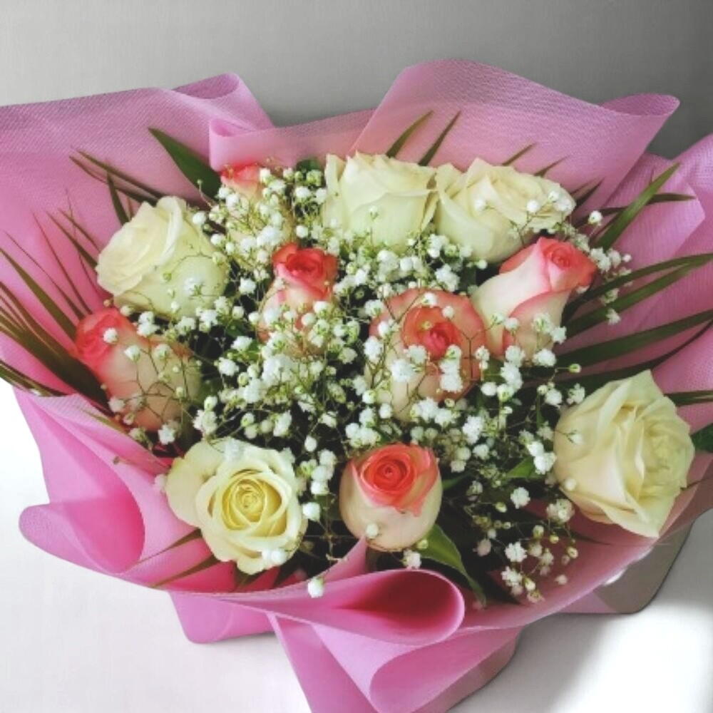 Este encantador ramo irradia suavidad y ternura con su delicada mezcla de rosas crema y rosa rubor, acentuado por una nube de paniculata. Envueltо en papel rosa pastel, es un regalo perfecto para expresar afecto, gratitud o deseos sinceros. La suave paleta de colores lo hace ideal para cumpleaños, aniversarios o simplemente porque sí. Mantén el ramo en un lugar fresco, alejado de la luz solar directa y de las corrientes de aire. Corta los tallos en diagonal y colócalos en agua limpia, cambiándola cada dos días. Rocía ligeramente con agua para mantener las flores frescas y hermosas.