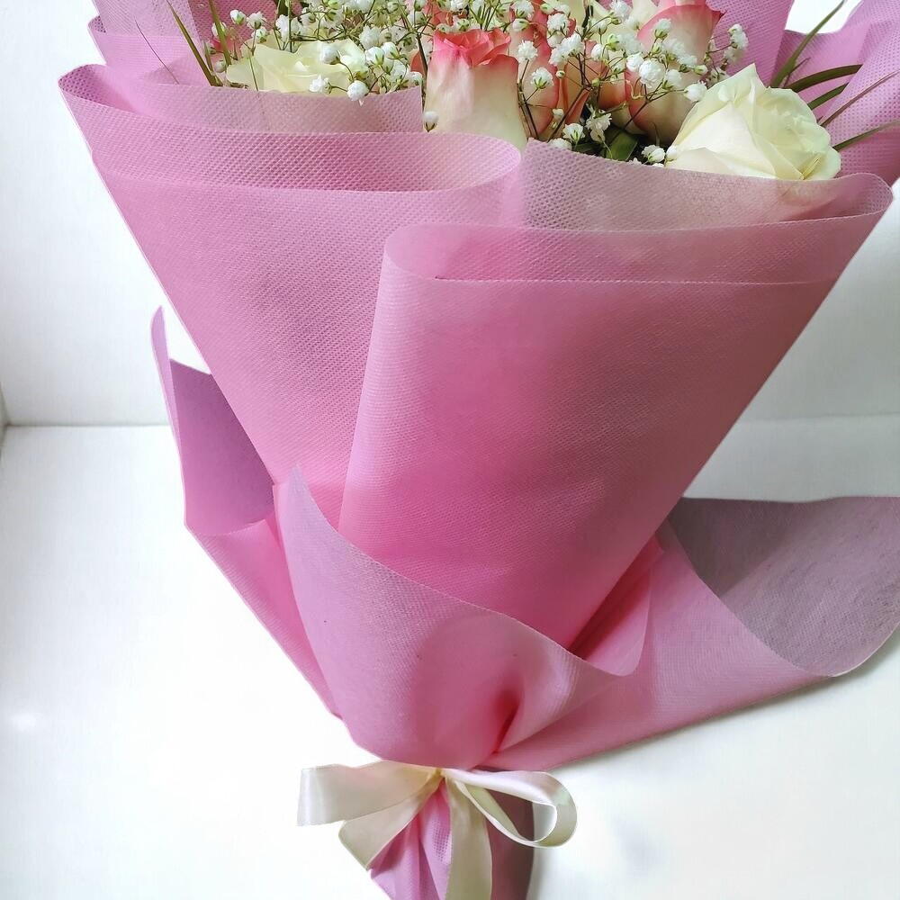 Pink rose - 6 ud. White rose - 5 ud. Gypsophila - 6 ud.