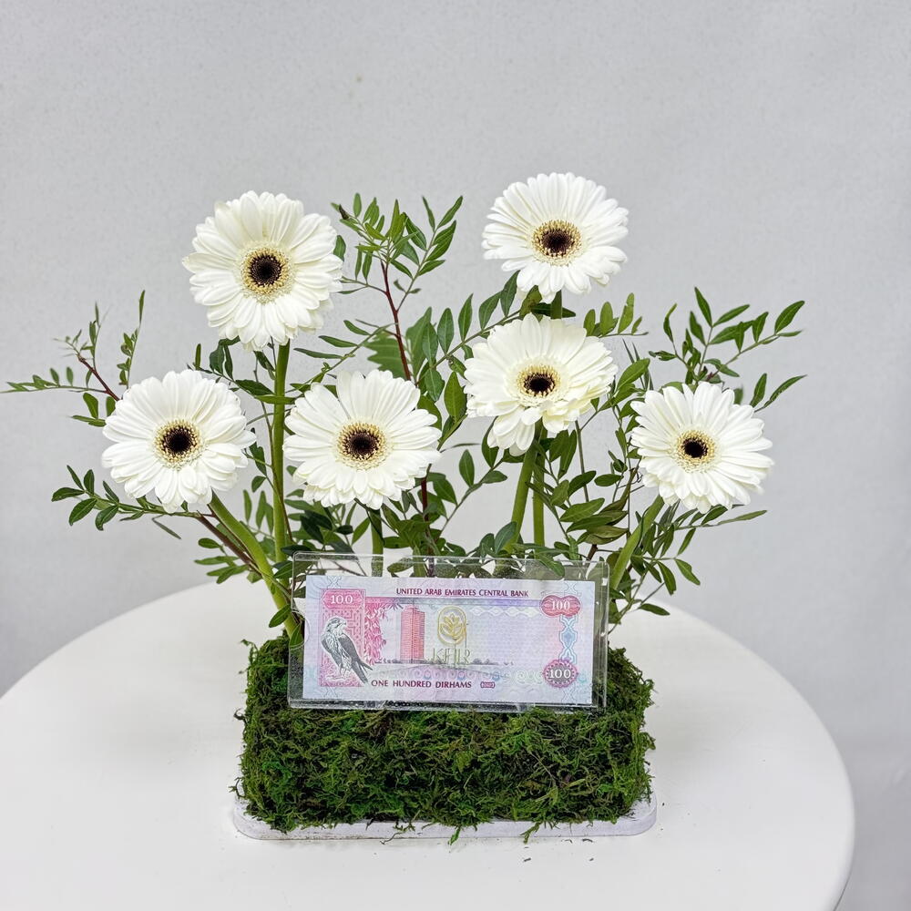 gerbera blanca - 6 ud. alcancía acrílica - 1 ud. hojas de pestacia - 2 ud.